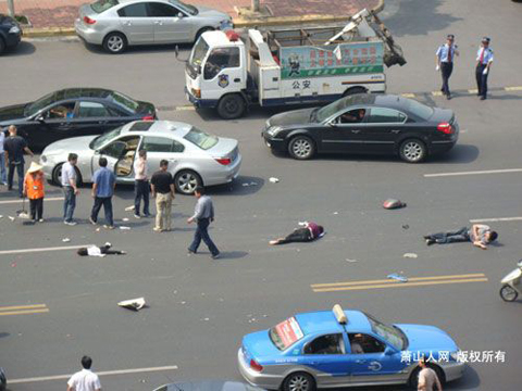 昨天上午11點左右,當記者趕到事發現場時,留在金城路現場的血跡清晰可見。馬路上,圍觀的人群談論著當時的一幕。一位姓汪的先生說,受傷最嚴重的是一個4歲小女孩,已被好心司機送往蕭山醫院搶救,而兩個被撞的大人,則被送到了蕭山中醫院救治。