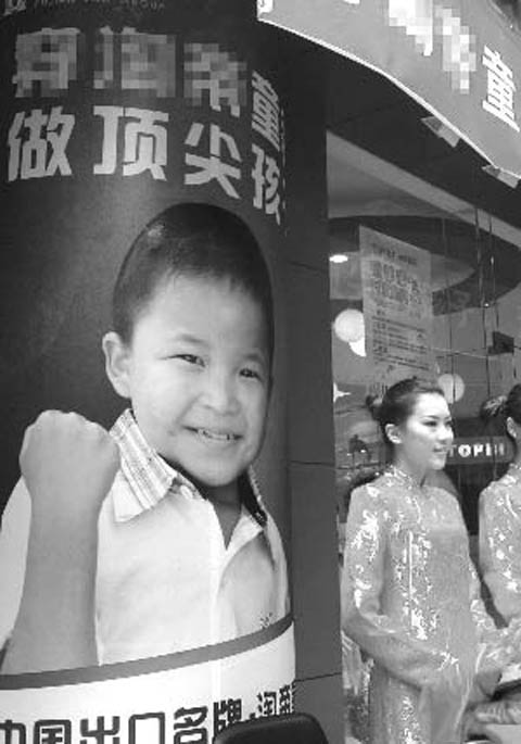 該童裝旗艦店裝修也比較豪華。店子正對門口的柜臺上,一個精致的像框中有多幅林浩出席各種場合的照片和文字說明。顧客一走進店子,就可以一眼看到。在現場,該品牌童裝公司董事長周訓財說,這是該品牌公司在全國700多個經營店中面積最大的一個,租店到裝修,投入了約50萬元。