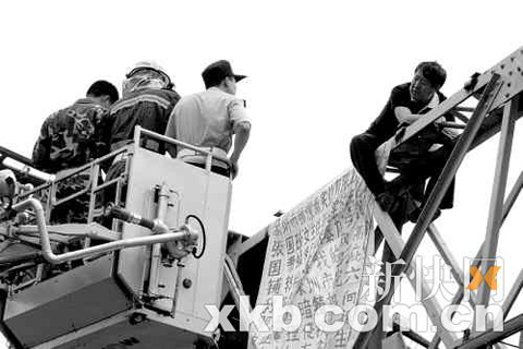 記者昨日9時45分趕到現(xiàn)場時,警方已經(jīng)將海珠橋雙向封鎖。在海珠橋西北端的鋼架上,一名身穿黑色T恤的男子正坐在上面,在其右后方掛著一張寫滿紅字的橫幅,男子還不時丟下幾張紙。據(jù)稱,坐在橋上的男子叫張丁盛,60歲,山西人,因為在深圳租的店鋪被人收回,去法院起訴又得不到解決,所以爬上海珠橋討說法。