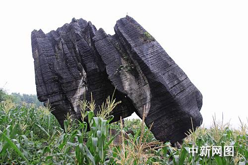 記者在長寧縣梅硐鎮中坪村看到,這兩塊“奇石”緊緊依偎連在一起,巋然不動地聳立在一塊玉米地中間的石灰石上,成60多度角向南傾斜;每塊“奇石”高10米左右,周長在12米以上;“奇石”底部與地面出露的石灰石基巖并未“生”在一起,而是像放在上面一樣。南(左)面的那塊石頭要“矮胖”些,與地面有兩個接觸點;北(右)面的則“苗條”些,與地面只有一個接觸點。