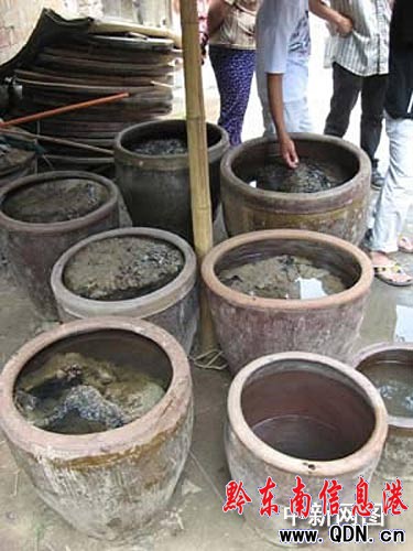記者在征得吳先生家人同意后,好奇地試探性抱起一塊普通水桶大小的成型“太歲”�!昂弥匕。 庇浾甙l現,這塊“太歲”頭頂部兩邊各有一個穴狀的“耳朵”。還有一個缸內有一種像人皮膚顏色的皮狀物質,村里人說它看上去像狗皮,摸上去確有皮膚般的肉感。吳先生說這個是當時他挖的那些糊狀“太歲”的外皮。另外幾個沙缸中的都是整塊的像果凍一樣的靈芝狀的物質。“它們就像果凍一樣軟軟的,發粘,也說不出是什么形狀。”吳先生告訴記者,“網上都說它們能夠治病,我還找到有關專家進行了鑒定, 它們就是能治愈疑難雜癥的‘太歲’。‘太歲’是有靈性的,我們這幾天在家里都能感覺到,它們還活著,還在長�!�