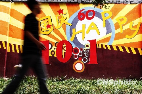 9月26日,北京街頭的“國慶文化墻”涂鴉吸引不少路人的目光。國慶節漸近,北京的大街小巷國慶氣氛日益濃厚。