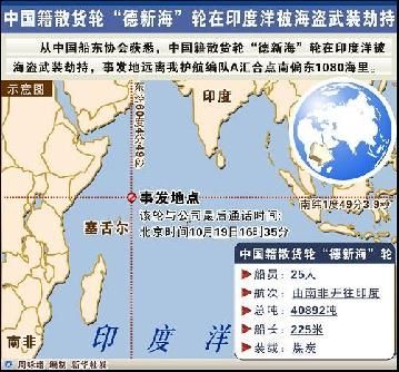 2009年10月19日,青島遠(yuǎn)洋運輸公司所屬“德新海”輪在印度洋被索馬里海盜劫持,船上有中國船員25名。事件發(fā)生后,中國政府高度重視,有關(guān)部門和企業(yè)積極開展?fàn)I救,確保被劫船員船只安全。