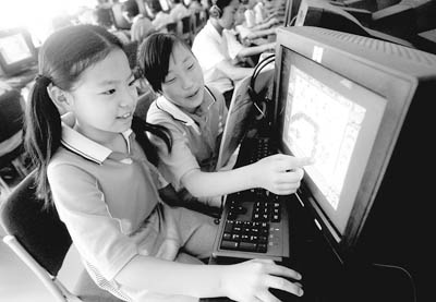 2009年6月22日,沈陽市黃河大街小學的學生在剛剛調試好的“校園綠色網吧”內上網沖浪。除了不健康的網站和容易讓學生沉溺的網絡游戲無法登錄外,學生們在這里可以登錄國內各大網站,觀看中外大片和影音資料,玩百種益智游戲。 張浩攝