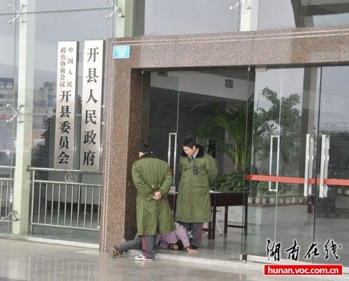 據人民網“圖說中國”欄目帖子介紹,1月13日下午4時許,一位年近半百的農婦,背著包裹到重慶開縣政府辦事,卻因衣著“不整”,被兩名守樓保安倒提兩只腳拖行數米后,扔到地上。隨后,農婦哭著準備再次爬進縣政府大門,卻被兩名保安用腳踢出。