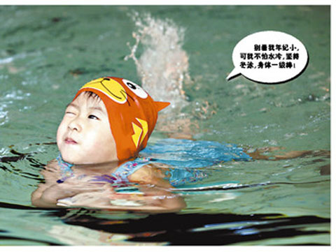 昨日天氣略回暖,不過單衣浸在泳池中依然感到冰涼。中午1時(shí)許,稍作準(zhǔn)備運(yùn)動(dòng)后,小晨曦沒等奶奶的招呼,便一頭鉆進(jìn)水中。