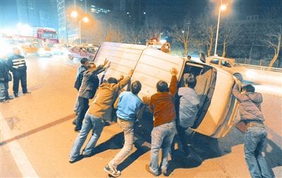 晚10時40分許,交警開來一輛警車和一輛牽引車,多次嘗試用鋼繩拉正面包車,均失敗。現場有人提議,在牽引車拉的同時找人幫忙抬車,現場采訪的2家報社的記者、面包車司機和富康車上的幾名男子共7人一起上前抬車,很快將車扶正。