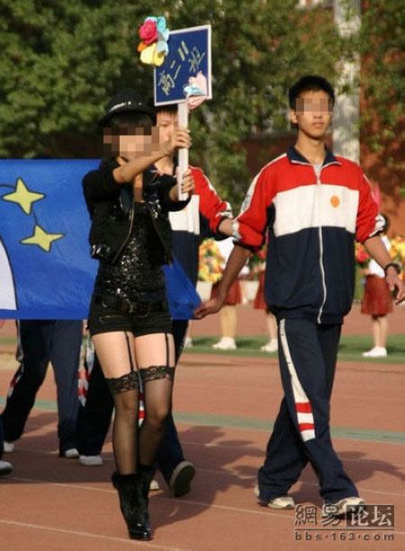 高中女生體育節上穿吊帶黑絲襪 引網友熱議