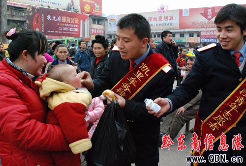 本港訊 (荷莉 通訊員 姜澤鵬)春運(yùn)以來,凱里車務(wù)段愛心隊(duì)幫助一些孕婦、帶孩子的、殘疾人等重點(diǎn)旅客候車免費(fèi)提供送飲料、面包等食品,同時(shí)對(duì)確實(shí)困難的旅客及時(shí)實(shí)施救助,讓他們?cè)诋愢l(xiāng)感受到在家的溫暖。圖為2月24日凱里車務(wù)段春運(yùn)愛心隊(duì)為旅客的孩子免費(fèi)送飲料、面包等食品。