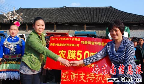 本港訊 (秦昊茗 特約記者 黃曉海 攝影報(bào)道)4月29日,中國(guó)農(nóng)業(yè)電影電視中心鄭學(xué)莉副書(shū)記、安徽中誠(chéng)塑業(yè)科技有限公司胡雪林總經(jīng)理等一行來(lái)到丹寨縣開(kāi)展“手挽手抗干旱愛(ài)心地膜”捐贈(zèng)行動(dòng),向丹寨縣捐贈(zèng)價(jià)值約80萬(wàn)元的抗旱地膜50噸。丹寨縣縣長(zhǎng)龍先金主持了當(dāng)日的捐贈(zèng)儀式,丹寨縣委書(shū)記古鵬在儀式上作了重要講話,他表示,2009年7月以來(lái),丹寨境內(nèi)出現(xiàn)了夏秋冬春四季連旱罕見(jiàn)現(xiàn)象,造成直接經(jīng)濟(jì)損失8162萬(wàn)元,是黔東南州受災(zāi)最重的縣份。