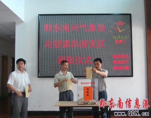 “6.06”望謨特大暴雨洪澇災害發生后,黔東南州氣象局迅速響應省委及州委《關于組織向望謨縣等洪澇災區開展捐贈活動的緊急通知》,于6月21日上午組織全體干部職工舉行了“向望謨洪勞災區捐款儀式”,號召全局干部職工發揚中華民族“一方有難、八方支援”的傳統美德,向承受災難的災區人民送上溫暖和愛心,職工們紛紛積極踴躍的將自己的愛心用信封裝載著投到了捐款箱里,僅不到一個小時的時間,就捐款4000余元,職工們紛紛表示,最近經常從電視和網絡上看到望謨洪災的圖片報道,觸目驚心之余更感覺到大自然的威力,作為一名氣象人,責無旁貸的去捕捉風云變幻的信息后,輔助為一些氣象災害帶來損失的災區做好災后重建,是我們氣象服務的后續工作,正所謂體現了氣象人“以人為本”的服務理念。目前,捐款活動還在進行當中。