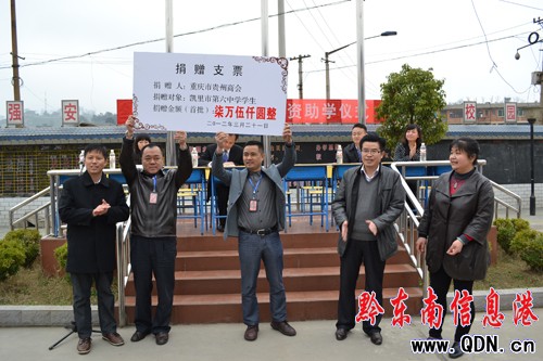 3月21日,重慶市貴州商會的企業(yè)家們在凱里市教育局、民政局、慈善總會等部門領(lǐng)導(dǎo)的陪同下,帶著他們的愛心來到了市第六中學(xué),為25位品學(xué)兼優(yōu)、家庭貧困的學(xué)生送去了75000元的愛心捐款。