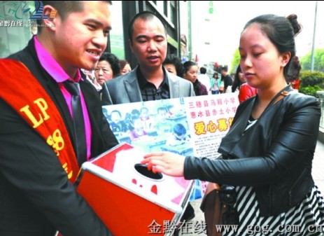 “請給山區小學獻點愛心,你的愛心可能會給他們改善學習環境。”昨天下午,記者路過貴陽城噴水池時,4個年輕人分別拿著捐款箱和一張捐款廣告告訴行人,惠水縣赤土小學和三穗縣馬鞍山小學需要幫助。一些市民仔細聽了后,拿出10元到100元不等的錢,紛紛投入捐款箱。