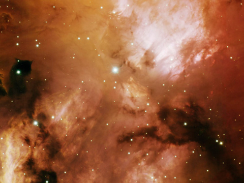 “恒星幼兒園”并不是均一發亮,如圖所示,這是一個叫做“NGC 3582”的星云,該區域孕育著恒星,它距離地球1萬光年,位于船底星座。在這里暗色灰塵云與發光氣體共享空間,由年輕恒星的紫外線光照亮,灰塵云中的束狀結構是由年輕恒星的放射物質形成,這些放射物質是由鄰近的短壽命超大質量星體爆炸釋放的。這張照片是由智利安第斯山脈的雙子南方望遠鏡拍攝的。