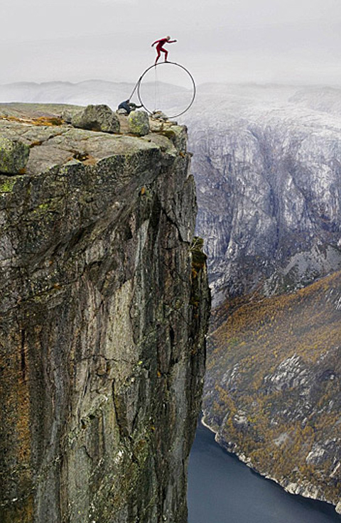不過,埃斯基爾至今最具有轟動效果的是在挪威著名的呂瑟峽灣的表演。當時他讓人在一座1000米深的海邊峽谷之間架起一根鋼索,然后赤身裸體地倒立騎著一輛單車,借助車輪下方懸掛的一塊重物保持平衡。最終,他在眾人的屏氣凝神中,冒著瑟瑟寒風和山間的氣流,騎到了終點。
