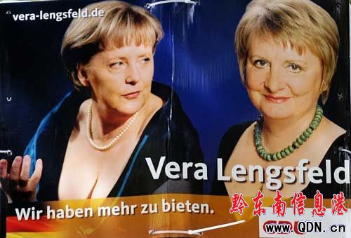 據新加坡《聯合早報》報道,德國基督教民主聯盟成員倫斯費爾德將在下個月27日的選舉中,競選柏林一個左翼選區的議席。她的競選團隊最近張貼的競選海報,展示了她本人和默克爾并列在一起的照片。兩人都穿上低胸晚裝,露出了性感乳溝,上頭還打上“我們還有更多可以奉獻”的標語。