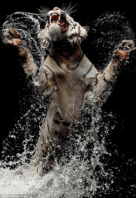 威風(fēng)!孟加拉虎沖出水面搶食瞬間(組圖)