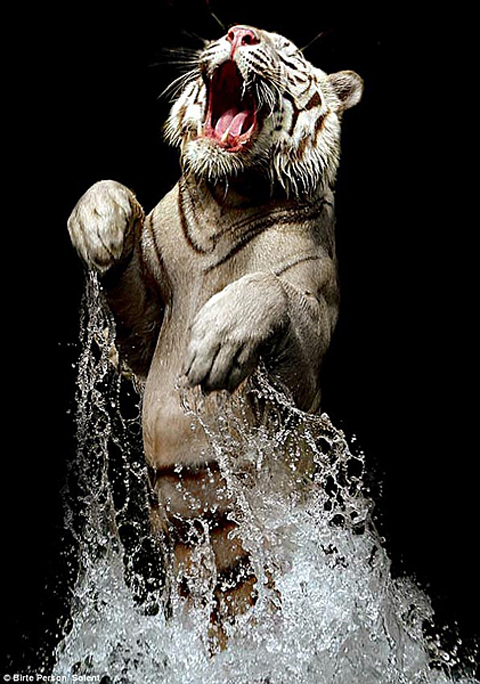 一只白色孟加拉虎躍出水面,露出長(zhǎng)牙仰天咆哮,準(zhǔn)備搶食管理員扔下的食物。來(lái)自澳大利亞新南威爾士的攝影師波特·皮爾森在新加坡動(dòng)物園抓拍到了白虎進(jìn)食的畫面,當(dāng)時(shí)這只孟加拉白虎和其他五只老虎正大秀捕獵技巧。