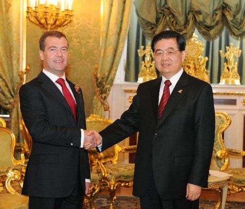 5月9日,中國國家主席胡錦濤在莫斯科同俄羅斯總統梅德韋杰夫舉行會晤。