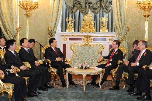 胡錦濤強調,在雙方共同努力下,中俄關系進入新的發展階段,兩國在國際事務中的配合更加緊密。中方愿意同俄方一道努力,抓住機遇,應對挑戰,全方位深化各領域合作,推動中俄戰略協作伙伴關系向更高水平發展。雙方應該積極提高經貿合作質量和水平,不斷優化貿易結構,規范貿易秩序,推動經濟技術合作和大項目合作;積極深化能源合作,以落實《中國東北地區與俄羅斯遠東及東西伯利亞地區合作規劃綱要》為契機,推動兩國毗鄰地區合作邁上新臺階;加強人文交流合作,大力推廣漢語和俄語教學;推動兩國青少年交往常態化機制化,認真落實1000名俄羅斯中小學生赴華參加夏令營活動;充分發揮中俄友好、和平與發展委員會作用。