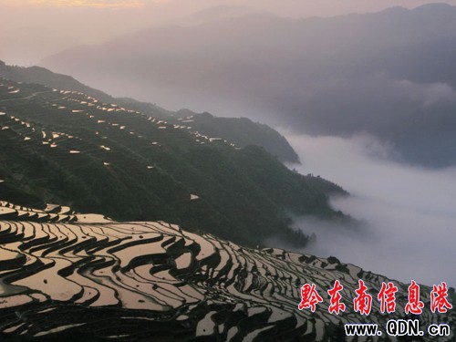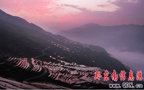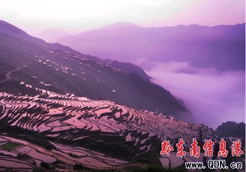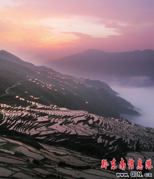 本港訊 (莫曉樹(shù) 攝影報(bào)道)從江縣加榜鄉(xiāng)境內(nèi),地處月亮山腹地,距離縣城80公里,分布著2000余畝梯田,當(dāng)?shù)厝朔Q之為加榜梯田,從黨扭村至加榜鄉(xiāng)所在地連綿25公里的梯田間居住著苗、壯、侗、瑤等十多種民族,吊腳木樓與梯田縱橫交錯(cuò),形成逶迤的迷人美景。圖為5月23日晨曦里拍攝的從江縣加榜鄉(xiāng)梯田美景。