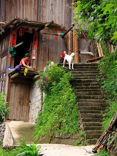一位中年婦女從糧倉間的石子小徑間踱著方步走了出來。只見此女長發高盤于頭頂之上,一柄翹角木梳橫插于腦后發髻間,讓人不由想起了"云鬢花顏金步搖"那樣的詩句。發髻看上去很唐朝,只是眼前這位婦女,沒有唐代貴婦那樣的珠光寶氣,卻多了些尋常百姓家洗衣做飯的人間煙火味道。