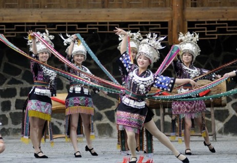 新橋苗寨跳蘆笙舞時,與其它苗寨的舞步不一樣,他們旋轉、彎曲的動作幅度大,點子輕快,花帶飄逸,銀光閃爍。苗族“錦雞舞”的創意即源于此。