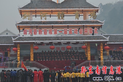 1月1日,劍河新縣城第一屆運動會在新建的體育場隆重開幕。來自該縣12個鄉鎮及縣級各機關、企事業單位、學校、革東鎮附近村寨參賽運動員及群眾近2萬人參加了開幕式活動。