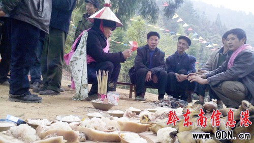早上9點左右,在招龍坪安放的龍身前,由祭師主持招龍儀式,用豬頭、糯米飯、雞、鴨、米酒等食物做祭品,祭師專心的用苗語念著口語,把每一戶人家都念到,恭請神龍護佑村寨里的每一戶人家,從今以后在神龍的護佑下年年平安、五谷豐登、百業興旺。