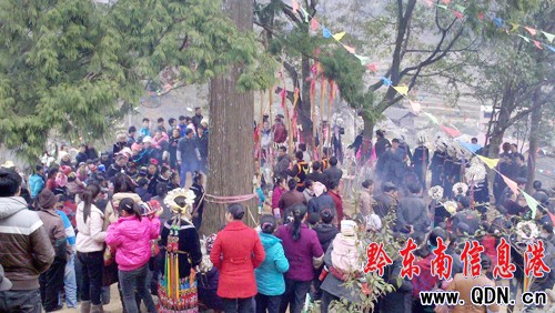 2012年正好是龍年,2月25日這天為龍天,男人們提前一天將精心雕琢的兩條龍身(一公一母,用上好的杉木做原料)安放在招龍坪的兩棵小葉香樟樹下,當天晚上12點(子時),5個引龍小組帶上鴨子、刀頭(豬肉切成長方形狀)、香燭、紙錢等物品前往五座靈氣十足的大山,擺上帶去的祭品,燃香燭燒紙錢,以毛色純白的鴨子引路(為什么要用白色鴨子:①白色代表純凈、虔誠、光明;②鴨子既能上天又能入水,神勇無比,化身神龍信使。),凌晨4點左右,5路引龍小組陸續將神龍一直引到村里的招龍坪,由師傅接手請龍歸位。