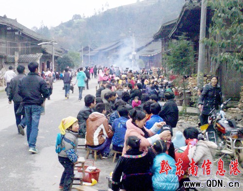 這一天,村里的男人們一大早就起來,一些人在村里殺豬、宰牛,一些人去山上挖樹(一般選擇臺灣杉、紅豆杉、香樟等常青名貴樹種),扛回來后栽在招龍坪、村子周邊。一些人在招龍坪上安凳子,叫聲、喊聲、敲打聲、音箱里播放的音樂聲,把整個村子都吵醒了,村子漸漸熱鬧、沸騰起來。這一天的女人是不用干活的,婦女、姑娘們起床后就開始梳妝打扮,從箱子里取出節日里才穿的苗族盛裝穿戴起來,臉上涂上胭脂抹上粉,鏡子照了一遍又一遍,都想把自己打扮成全村最美的人,迎接那些從四面八方趕來道賀的親朋好友。
