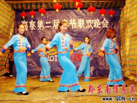 虎尾系金攏財氣,兔首搖玲蕩福音。大年初一的晚上,錦屏縣鐘靈鄉(xiāng)高寨村熱鬧非凡,在2011兔年高寨春節(jié)聯(lián)歡晚會現(xiàn)場,人頭攢動,暖意濃濃、激情四射。