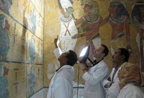 該科研組上個(gè)月首次到達(dá)埃及后,他們利用高科技產(chǎn)品X光機(jī)和照明設(shè)備分析墓穴墻壁上的漆層里的成分,只有查明油漆的確切成分,他們才能找出清理和保護(hù)壁畫的最好方法。在悶熱潮濕的環(huán)境下做這些非常費(fèi)事。對(duì)一小塊墻進(jìn)行分析,就需要花費(fèi)數(shù)小時(shí)時(shí)間。他們要做的第二部分工作包括,將游客對(duì)圖坦卡蒙墓的影響減小。很多到過(guò)帝王谷的參觀者好不容易擠到跟前,看個(gè)究竟,但感覺(jué)這個(gè)墓穴沒(méi)給他們留下太深印象,因?yàn)槟估锏拇蟛糠謻|西,例如所有黃金財(cái)寶,現(xiàn)在都保存在開羅的埃及博物館里。