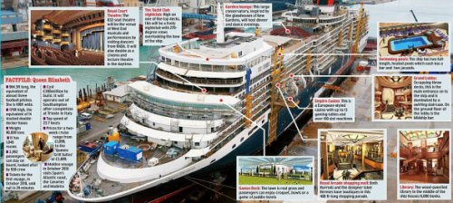 英國丘納德公司的新伊麗莎白女王號游輪盡管已經下水,但其處女航還需9個月的準備時間。這艘新游輪一如既往地保持王室標準,與第一艘伊麗莎白女王號1938年下水時類似。游輪上包括皇家宮廷劇院、游艇俱樂部夜總會、休閑花園、游戲甲板、王室購物中心、圖書館、游泳池、帝國娛樂場以及豪華休息大廳等。