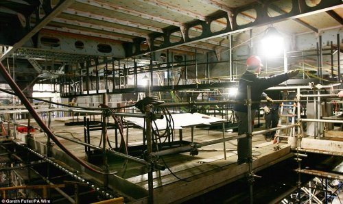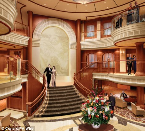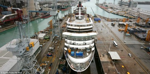新游輪內部的餐館依然在建設中。這艘游輪是意大利造船公司生產的,用以取代退役的伊麗莎白女王2號游輪。新游輪是丘納德公司過去7年中下水的第三艘豪華游輪,將與姊妹船維多利亞女王號和瑪麗女王2號一起運營。