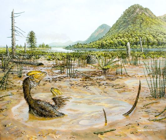 這幅繪畫作品展示了大約1.6億年前侏羅紀(jì)晚期的中國(guó)新疆地區(qū),畫中的兩只食肉恐龍五彩冠龍?jiān)谝粋(gè)泥濘的深坑中苦苦掙扎。五彩冠龍是一種小型獸腳亞目食肉恐龍,它們是一種兩足猛禽家族成員,繼承了包括霸王龍?jiān)趦?nèi)的恐龍血統(tǒng)。