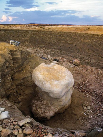 照片拍攝于2005年,展示了一個(gè)已被發(fā)掘的恐龍死亡坑。發(fā)掘工作造就了一個(gè)圓柱形沙巖和泥巖,高度在5.2英尺(約合1.6米)左右。迄今為止發(fā)現(xiàn)的死亡坑共有3個(gè),里面埋藏著20多個(gè)小型恐龍的化石,這個(gè)石柱所在的死亡坑便是其中之一。由于周圍巖石的特性,專家們認(rèn)為死亡坑實(shí)際上是凹陷所致,可能是巨大的腳印,里面充斥著泥漿。