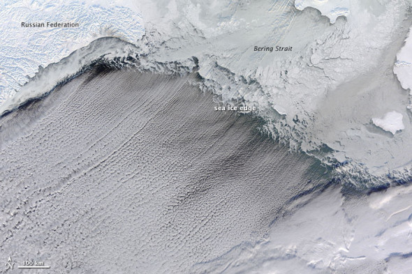 從照片可以看出,北方吹來的風不斷將海冰向南推進,并且在白令海峽上空形成壯觀的云街現象。云街就是一排排平行的積云。美國宇航局“陸地”衛星上的中分辨率成像光譜儀于2010年1月16日捕捉到這一壯觀的場景。在圖片的左上角,是俄羅斯聯邦的最東端,上面覆蓋著厚厚的冰雪。再向東,則是覆蓋于白令海峽之上的海冰。在海冰的最南端邊緣,則主要是最新形成的薄海冰,這些薄海冰形成了起伏不定的卷須。
