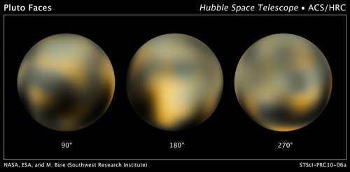 冥王星是頗受天文學家關注的星體,由于它體積很小,并且距離遙遠,它是很難被觀測的。哈勃望遠鏡能夠觀測到冥王星表面數百公里范圍的表面狀況,但這對于理解冥王星表面地質情況非常模糊。對于冥王星表面的色彩和亮度,哈勃望遠鏡揭示出復雜的表面結構,顯示冥王星表面帶有白色、黑色、橙色和黑巧克力色斑駁狀地形顏色。這些復雜表面顏色的形成是由于太陽紫外線輻射分解冥王星表面甲烷,從而在表面殘留黑紅色含碳剩余物質。