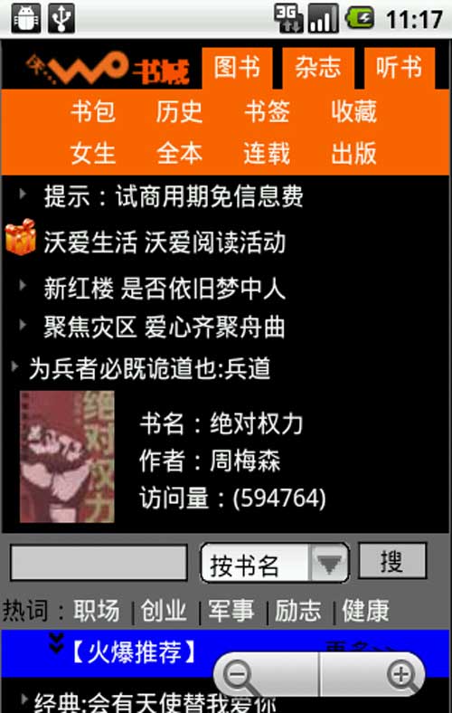 同時,閱讀頁面提示:目前,中國聯通手機閱讀業務正處于試用期,在此期間,任何書籍暫不收取信息費。待業務開通后,可選擇按次或包月的形式繼續使用。