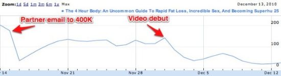 “video debut”箭頭所指以后曲線為YouTube宣傳視頻出爐后新書在亞馬遜排名的變化曲線。