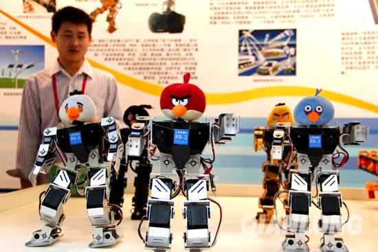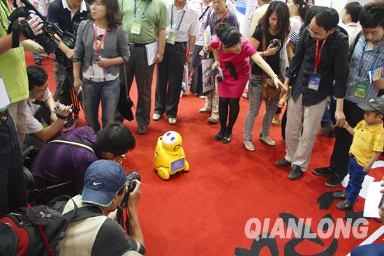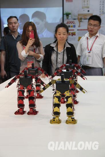 新華網訊 第十四屆中國北京國際科技產業博覽會5月18日開幕,在中關村自主創新成果展展廳,最能直觀體現智能科技的機器人成為參觀者的最愛,漢庫新源的智能機器人、特種機器人,森漢科技的舞蹈機器人、仿生機器人,以及紫光股份的幼教機器人等,在展廳里成為最“拉風”的展品。