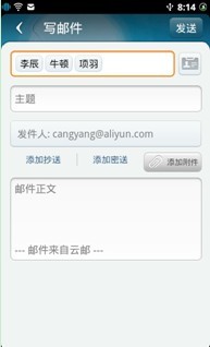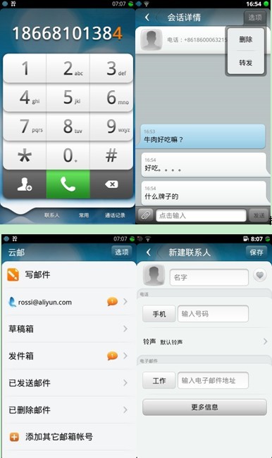 另外,阿里云手機的應用市場界面、撥號短信界面以及郵件界面截圖也流出并曝光。