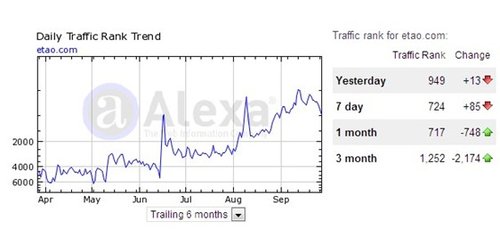 來自Alexa的數據顯示,阿里巴巴集團旗下購物搜索引擎一淘網在淘寶分拆獨立后上漲趨勢明顯,在近兩三個月內該網站的流量急漲了至少五倍,現已位居購物搜索類第一。