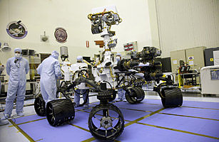 11月,美國宇航局的“好奇”號火星車在卡納維拉爾角發射升空,預計于2012年8月6日抵達火星。這輛火星車的體積與一輛SUV相當,是迄今為止派往火星的體積最大且性能最高的火星車。穿過火星大氣層過程中,“好奇”號將借助減速傘和空氣阻力減速,最后利用懸浮的“太空起重機”的繩索降落到火星表面。“好奇”號至少要在火星上跋涉兩年,執行一系列探索任務。這輛火星車將上演怎樣驚人的發現,讓我們拭目以待。