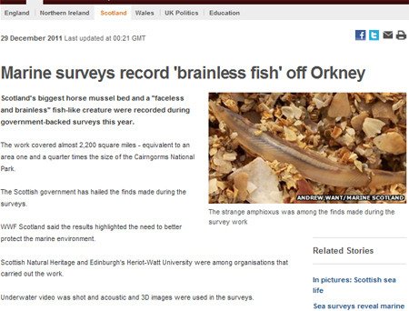 調查人員在奧克尼郡(Orkney)發現了史前“無腦無臉”文昌魚。這種極為罕見的物種被認為是第一批進化出脊椎的動物代表。