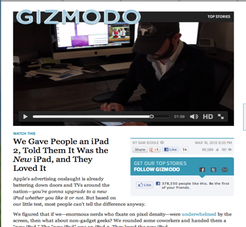 新浪科技訊 北京時間3月18日上午消息,美國科技博客Gizmodo在蘋果新iPad上市之后搞了個惡作劇:拿著iPad 2去采訪商業博客網站Gawker的網站編輯,結果多數受訪用戶都誤以為手中的平板真是新iPad。