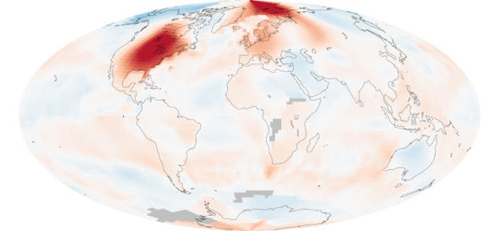 這幅地圖表明,今年3月,美國東部地區(qū)和加拿大安大略省(Ontario)、魁北克省(Quebec)及馬尼托巴省(Manitoba)的氣溫比標準溫度高了近10攝氏度(這些地區(qū)在地圖中顯示為深紅色)。類似的極端溫度也出現(xiàn)在北冰洋斯瓦爾巴群島(Svalbard)、巴倫支海(Barents Sea),喀拉海(Kara Sea)。而西伯利亞東部、美國阿拉斯加州和北美西北部的溫度則顯著降低,歐洲和俄羅斯西部的大部分地區(qū)溫暖也有所上升。
