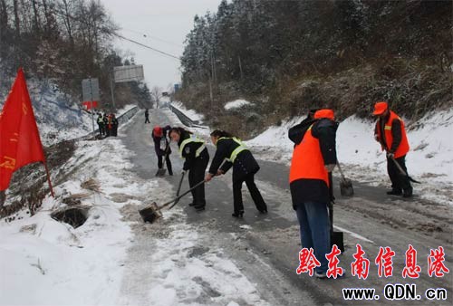 1月18日,受低溫降雪和凍雨天氣持續影響,貴州省黔東南州凱里公路管理局組織全州路政、公路養護人員900多人在全州的13條國、省道的路面結冰路段上,采取救助滯留車輛,除冰、撒砂防滑,撒鹽化冰等措施,力爭1月19日春運順利啟動。(高建成 夏毅元 特約記者 陳沛亮 攝影報道)