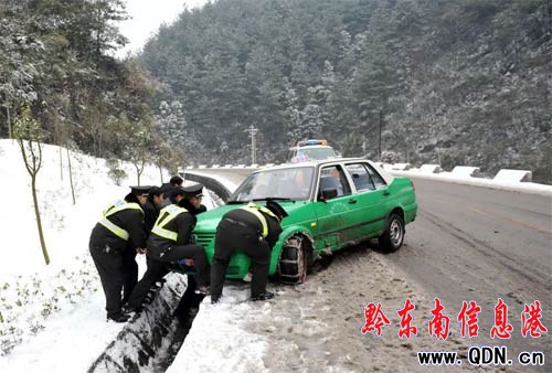 凱里公路管理段路政人員和群眾合力在凱里市龍場鎮境內的308省道282公里處救援一輛滑進公路邊的出租車